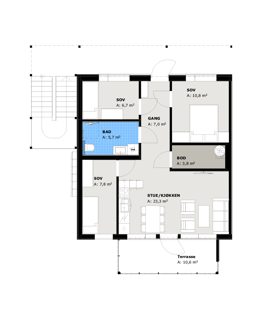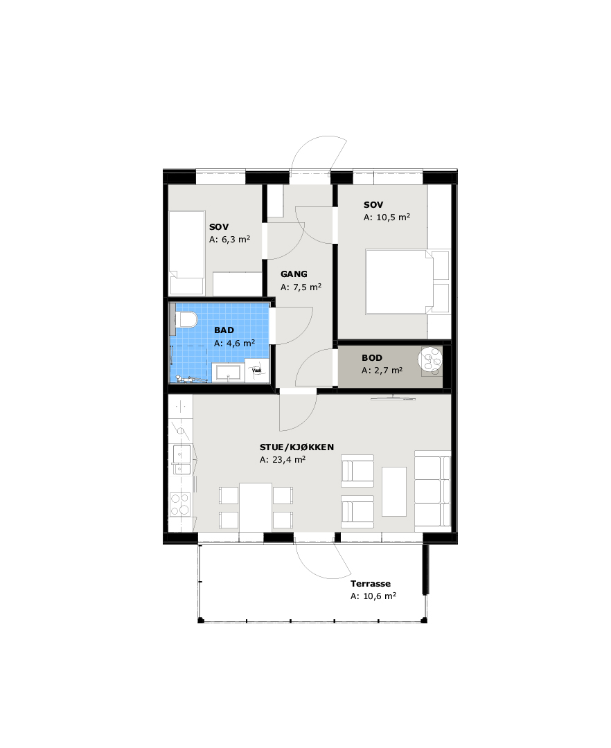 Boligen har en romslig og gjennomtenkt planløsning med alt på ett plan. Den åpne stue- og kjøkkenløsningen gir god plass til både hverdag og samvær, mens tre soverom, to bad og bod gir fleksibilitet for ulike behov. Trinnfri adkomst og utgang til terrasse gjør boligen komfortabel og lett å bo i – både nå og senere.
