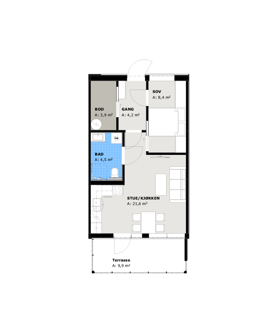 Denne leiligheten er smart planlagt med alt på ett plan og har et bruksareal (BRA) på 45,2 m². Planløsningen består av en åpen stue- og kjøkkenløsning som skaper en luftig og sosial sone, samt ett soverom, bad og bod samlet på en praktisk måte.