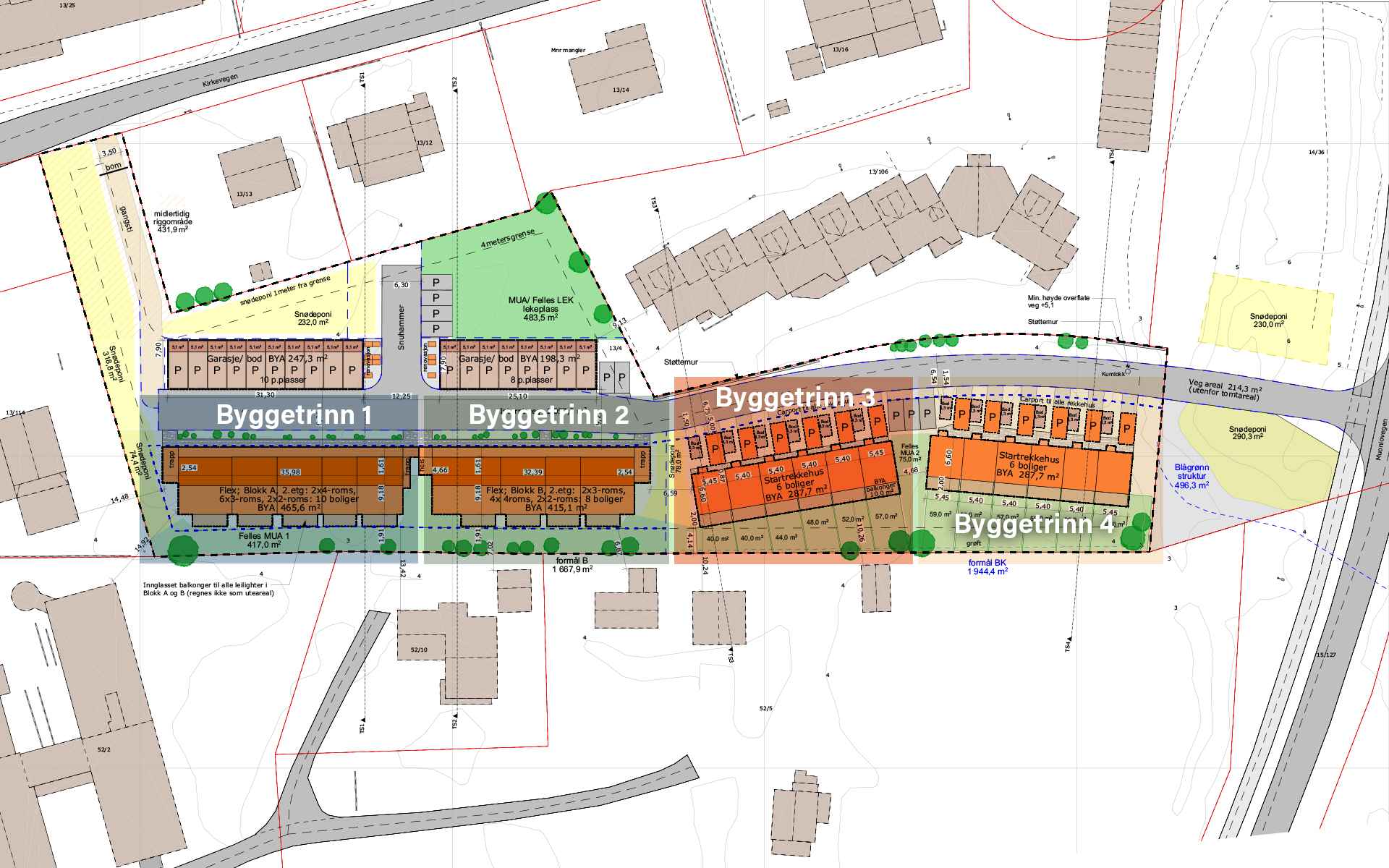 Prosjektet bygges ut trinnvis, noe som gir en ryddig og god utvikling av området. I planen kan du se hvilke boliger som inngår i byggetrinn 1, 2, 3 og 4.
